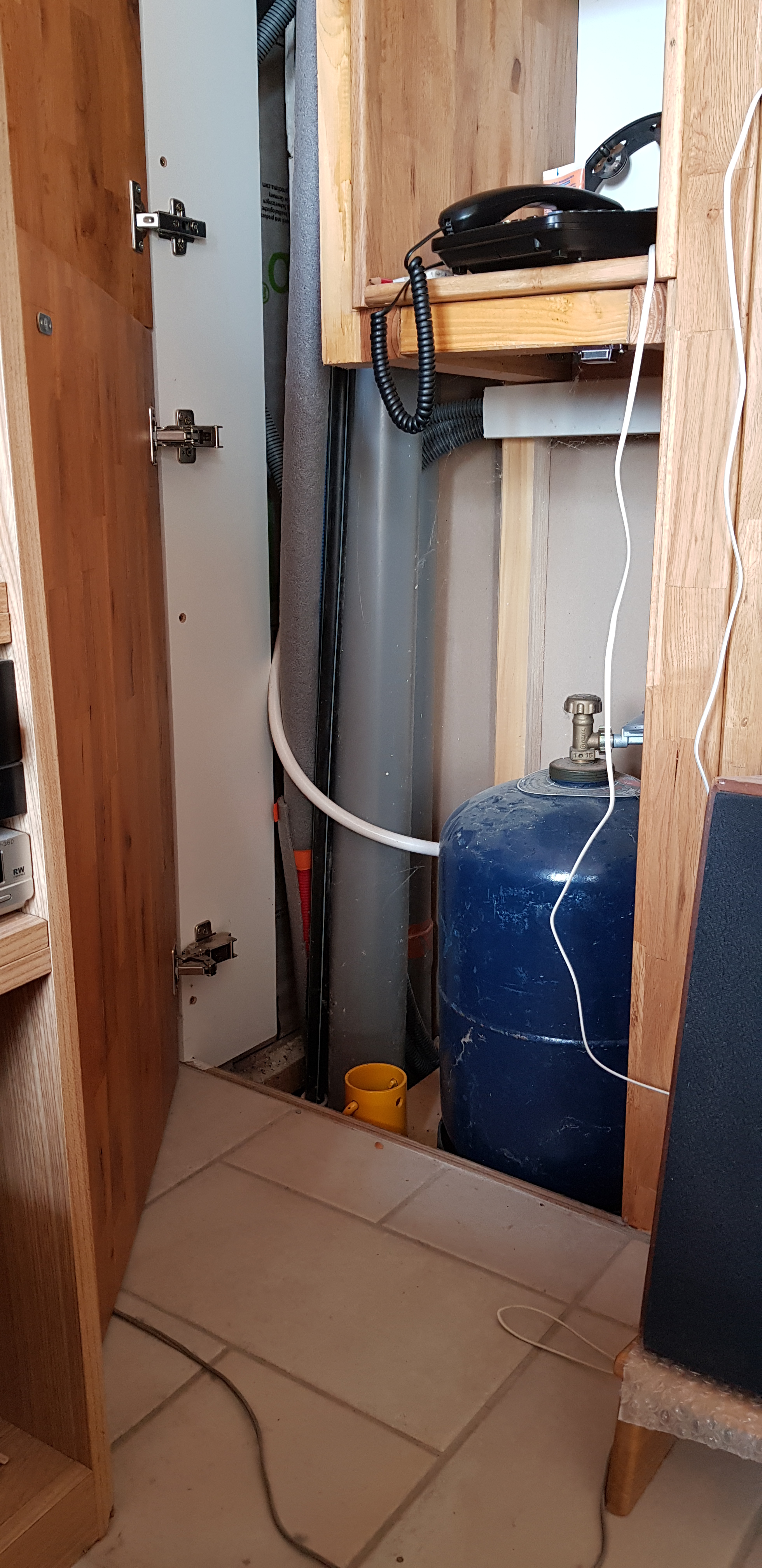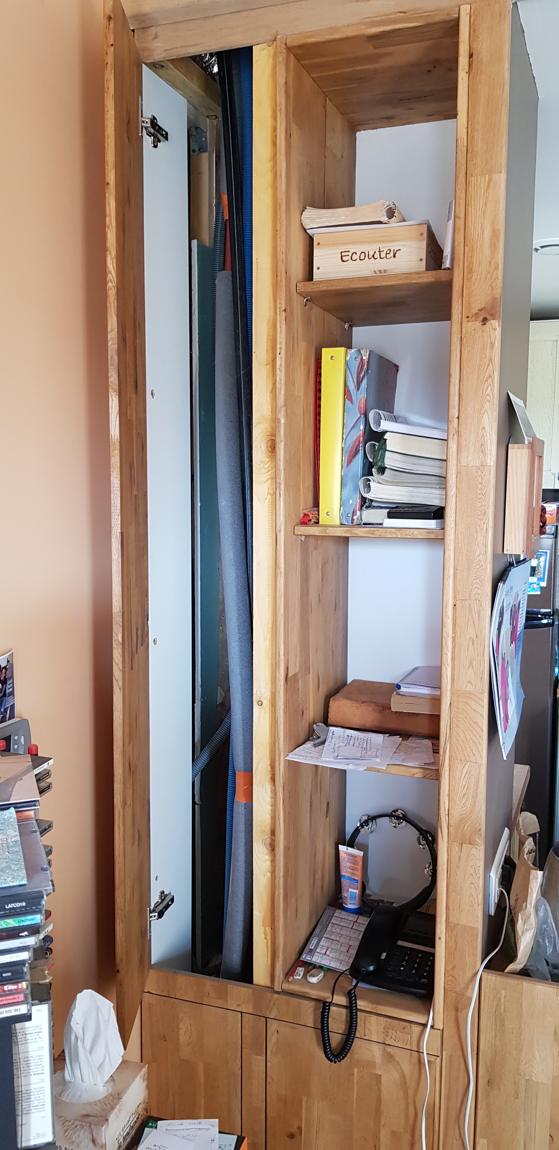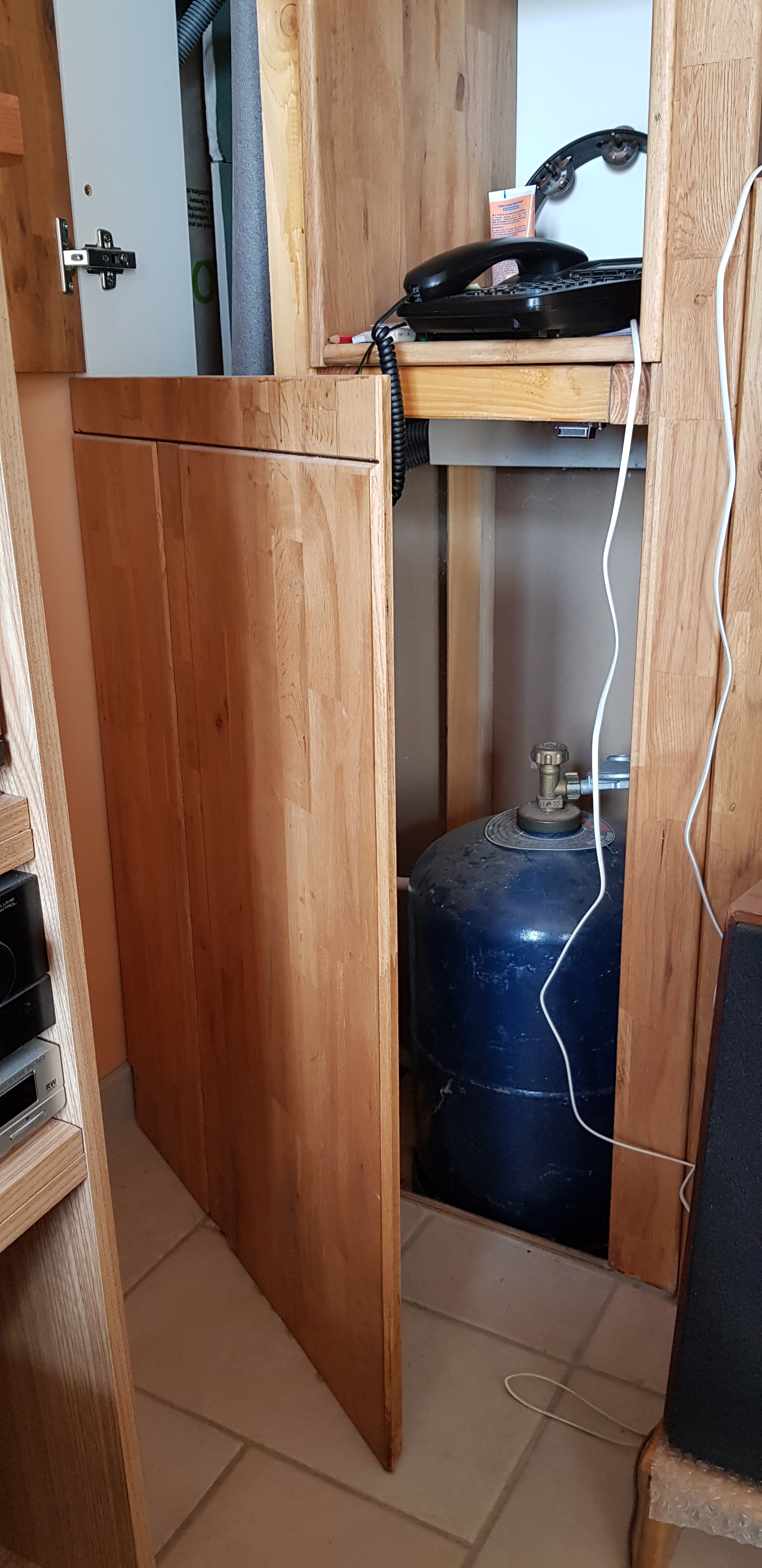 Portes de placards assorties et bibliothèque pour dissimuler les tuyaux des colonnes montante et descendante d'eau et la bouteille de gaz