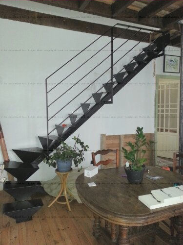 Marches posées sur l'escalier limon central fer.